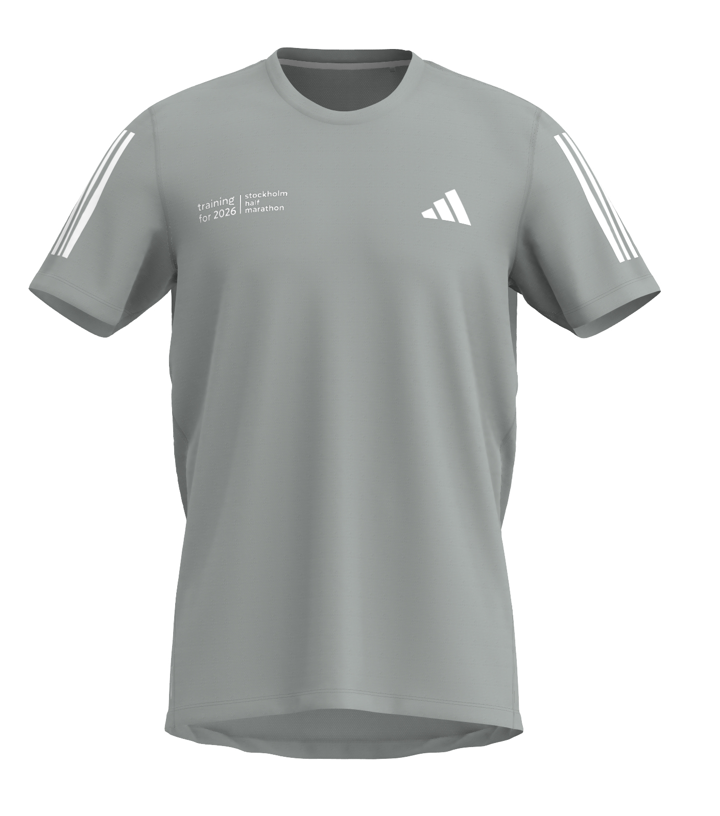 Grå adidas funktions t-shirt 100% återvunnen polyester. med tryck i vitt “Training for 2026 Stockholm Half Marathon”. Finns i dam- och herrmodell i storlekarna dam XS – XL och herr S – XXL.